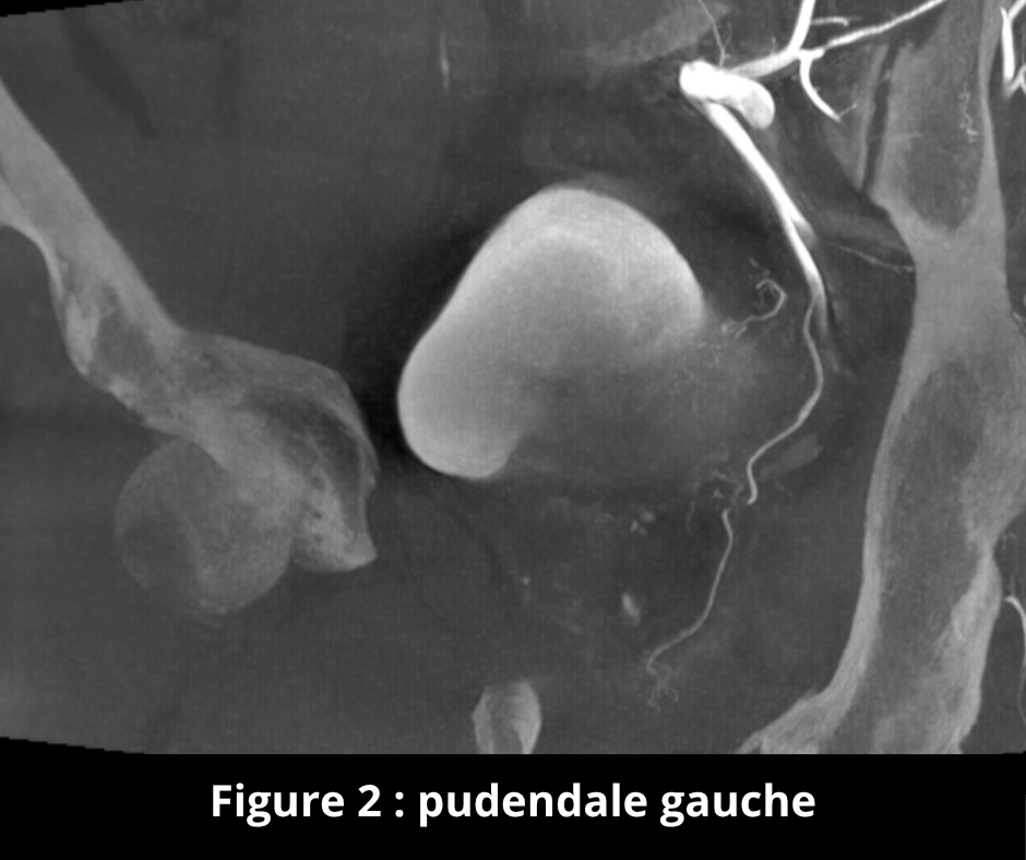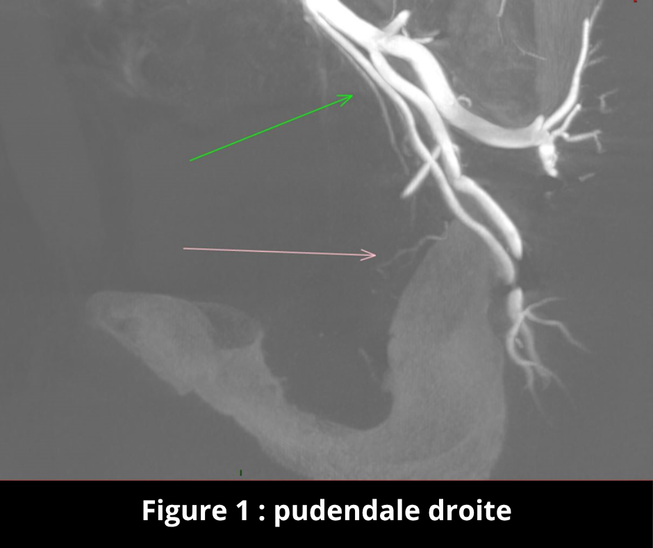 - Côté droit : naissance ectopique de l’artère pudendale interne à partir d’un tronc commun avec la bifurcation de l’iliaque interne.