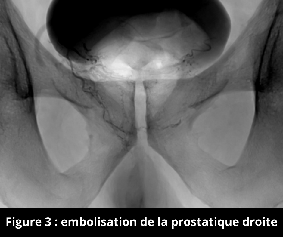 Figure 3 (ci-dessus): embolisation de la prostatique droite : observez les shunts intraprostatiques droits-gauches !